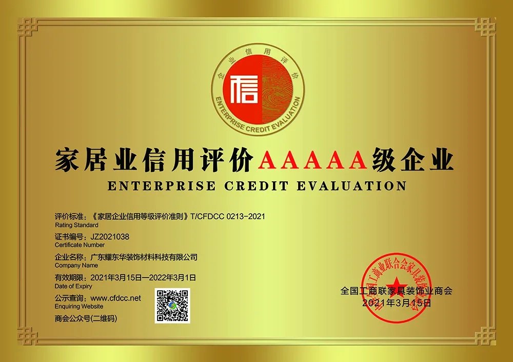 近日,耀东华公司被全国工商联家具装饰业商会评选为首批“家居业信用评价AAAAA级企业”,这是对耀东华公司的企业经营信用的肯定,也是对耀东华公司的质量、技术、品牌、生产、营销、社会责任等多方面实力的赞许。