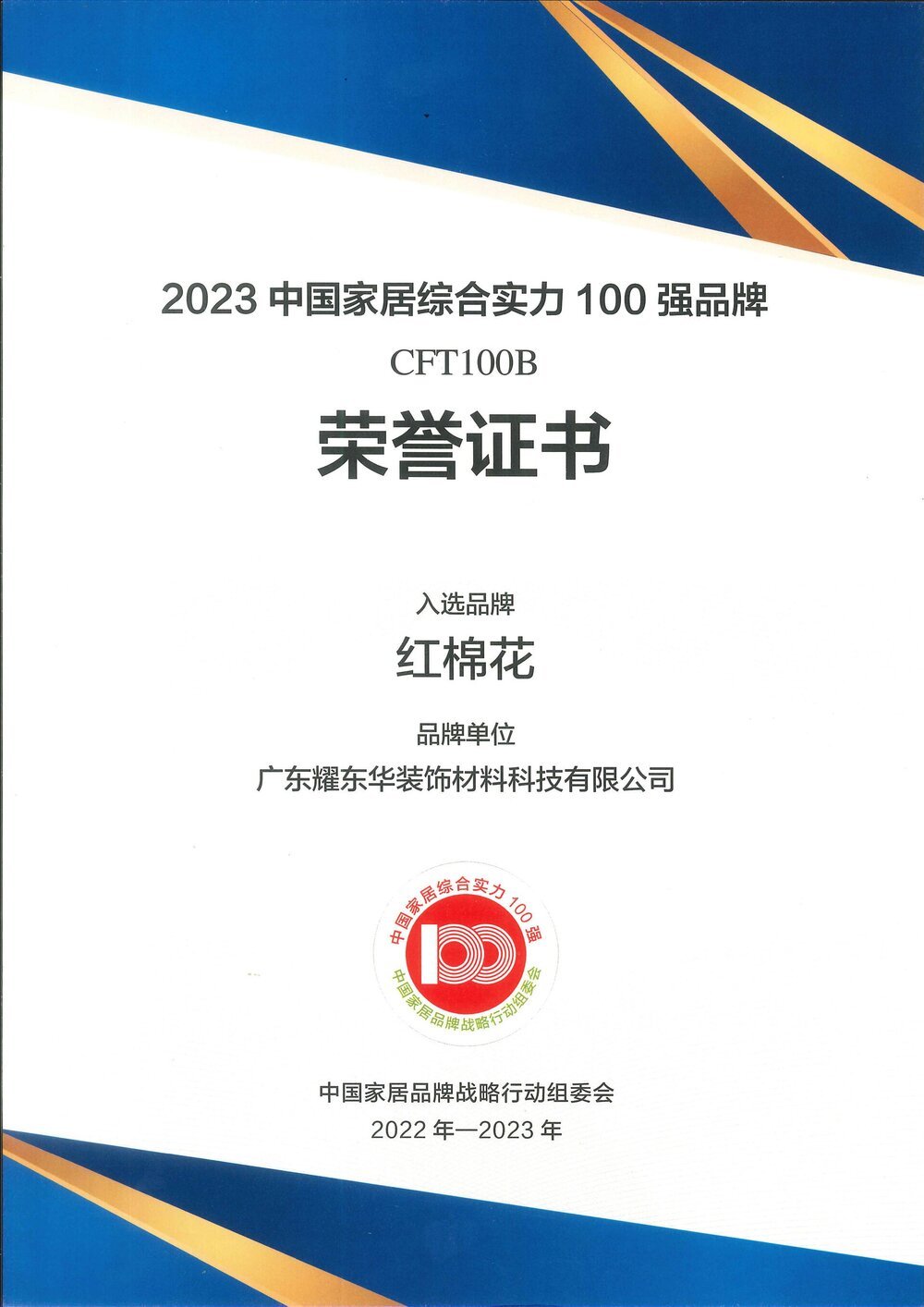 2023中国家居综合实力100强品牌证书