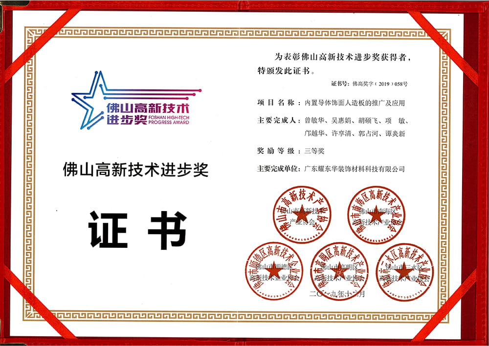 2020年1月8日,在佛山市科技局指导下,由佛山市高新技术产业协会联合各区高新协会共同主办的第二届“佛山高新技术进步奖表彰大会”在佛山中欧中心国际会议中心隆重举行!耀东华公司“内置导体饰面人造板的推广及应用”项目,荣获“佛山高新技术进步奖三等奖”。