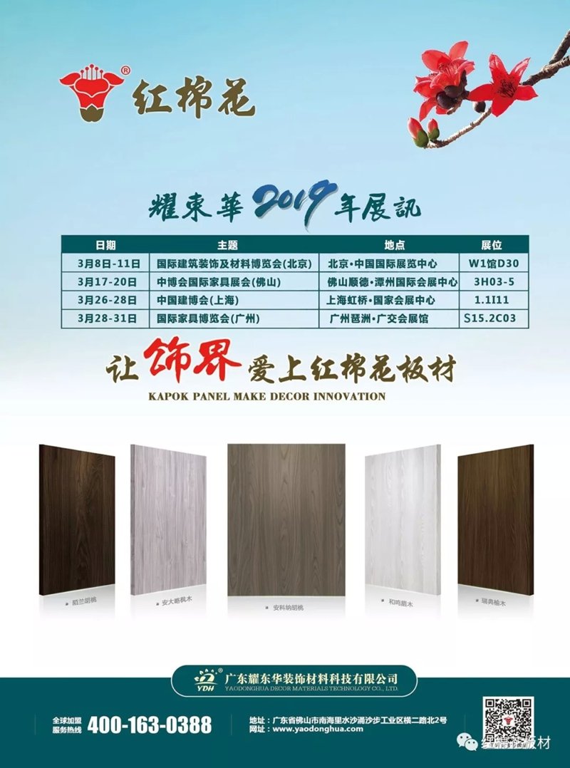 2019年3月17日-20日, 佛山顺德潭州国际会展中心, 耀东华公司, “红棉花板材”, 惊艳亮相第十六届中博会国际家具展会, 盛世美颜,C位出道! 跟我一起去看看吧……